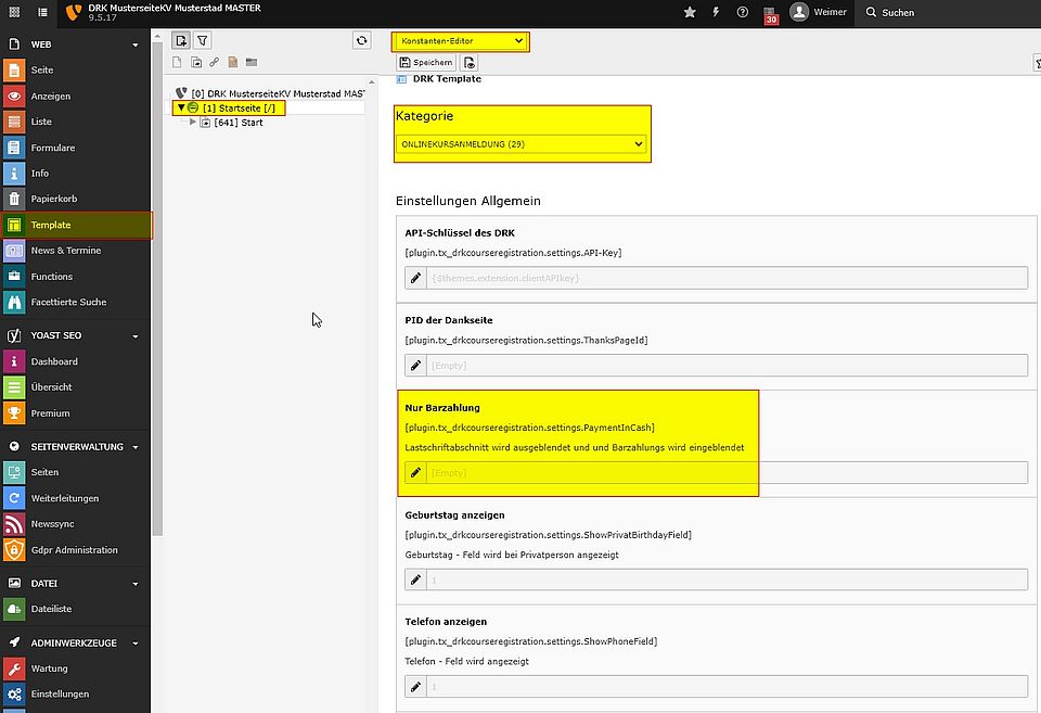 Unter Template -->Konstanten Editor --> wählen Sie die Extension drk_memberform oder drk_courseregistration aus.