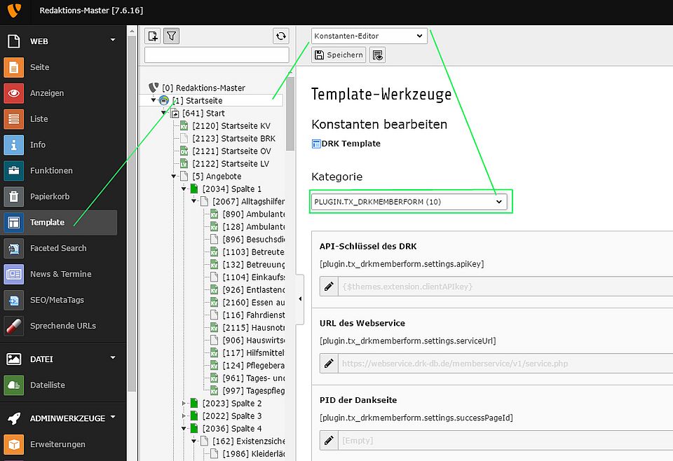 Unter Template --> Startseite --> Konstanten Editor --> wählen Sie die Extension PLUGIN.TX_DRKMEMBERFORM (DRK Mitglied werden und Onlinespende) aus.